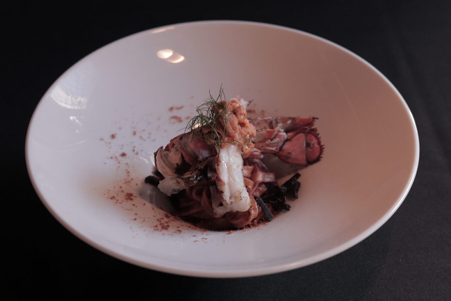 上にローストしたレモン塩とチュイルがお米でつくったお花のトリコデコール、召し上がれます。下にポルチーニ茸とフォアグラ。