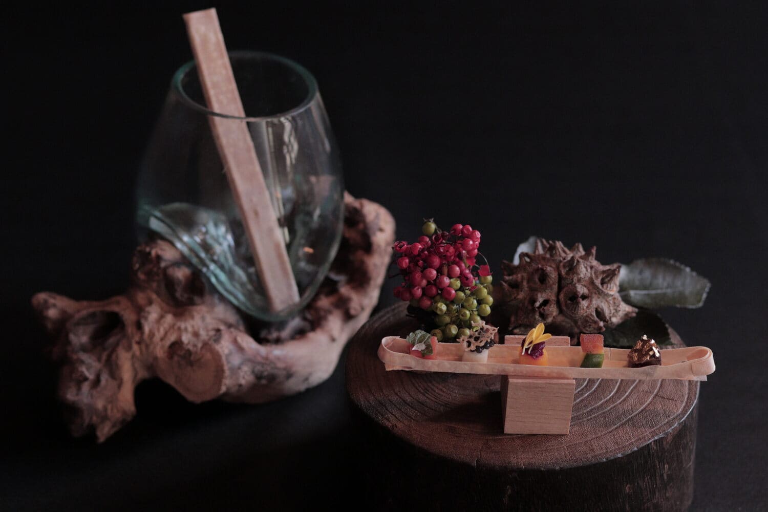 日本は木造の文化ですので最初は桐の切株で、ヨーロッパは石の文化なので最後は石で、混ざり合う混。混のコースです。