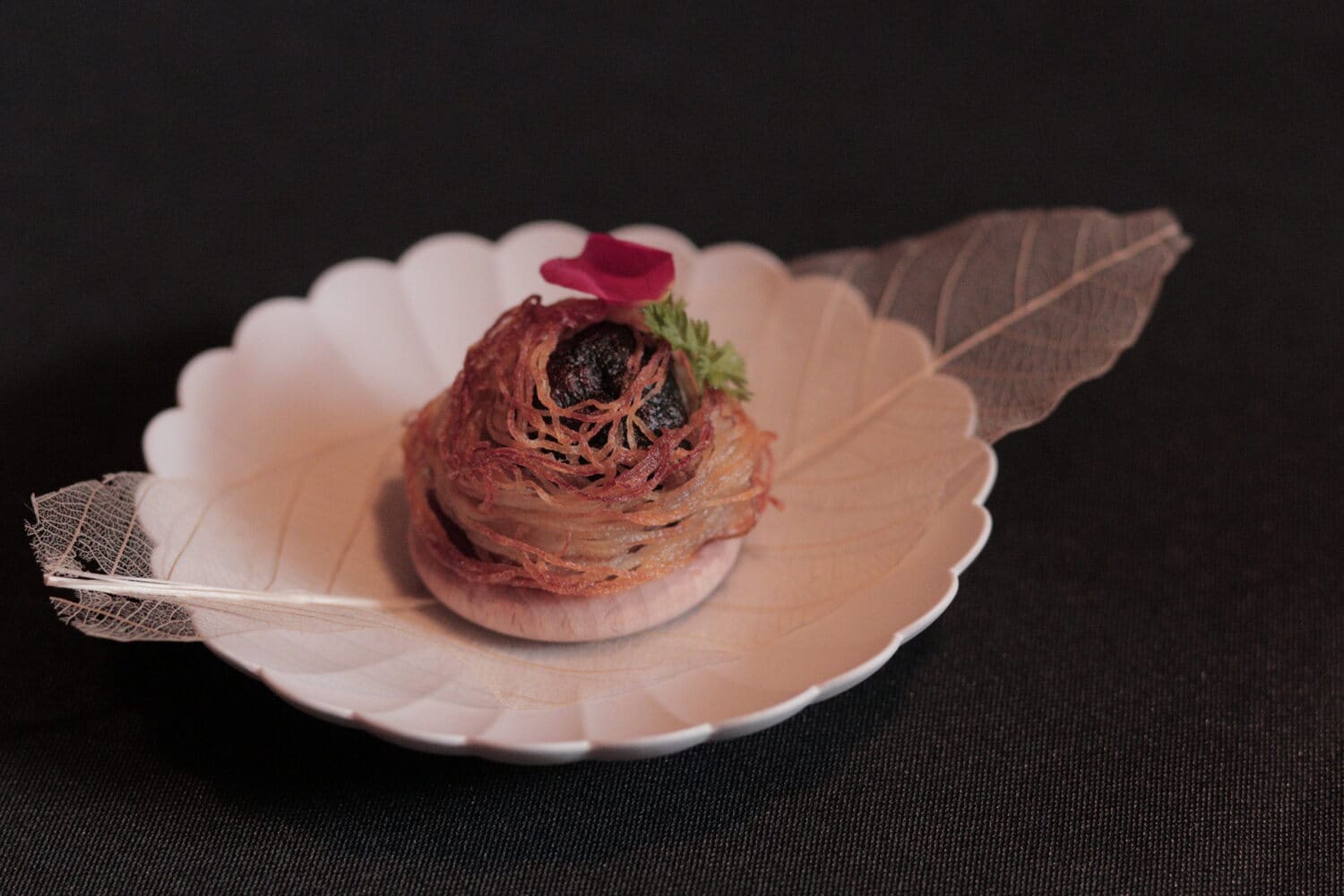 上にローストしたレモン塩とチュイルがお米でつくったお花のトリコデコール、召し上がれます。下にポルチーニ茸とフォアグラ。