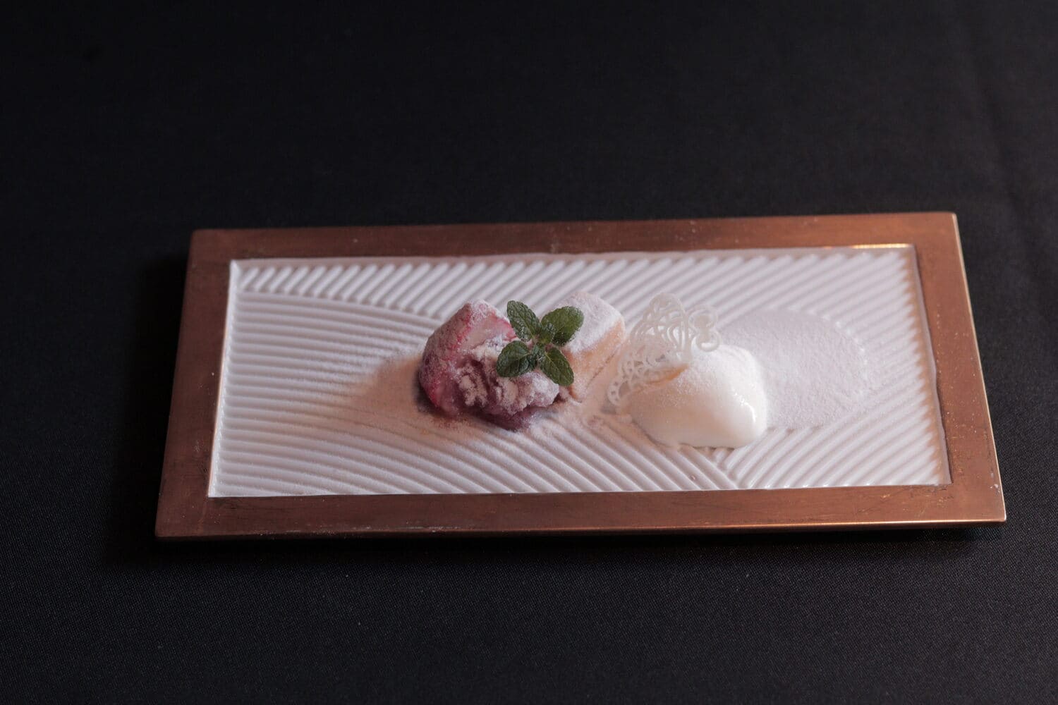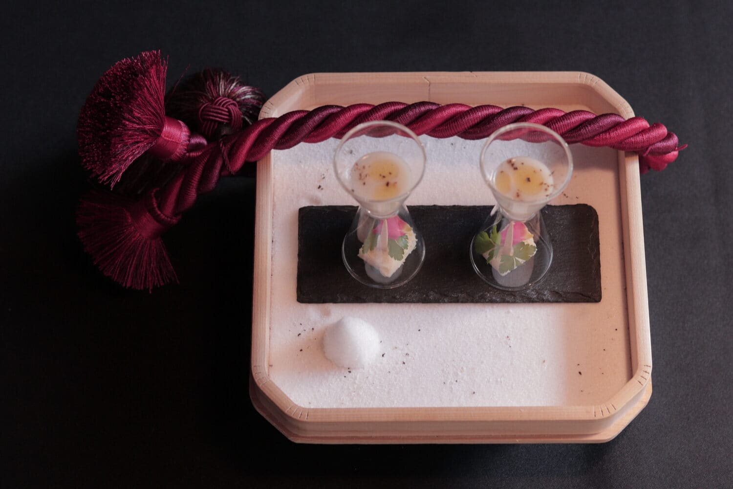 右肩上がりの末広りに御用意したイタリアの国旗の色、ビーツのピューレ、リコッタチーズ、1160年から続く世界最古の通圓の玉露(お肉味が強いので中和)